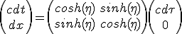 On utilise la formulation de changement de référentiel par transformation de Lorentz (voir le cours). On a besoin de ne considérer qu'une seule coordonnée, x, les autres étant invariantes. Dans le référentiel du mobile on considère un instant infinitésimal. Dans ce référentiel, le mobile reste centré sur l'origine. Dans le référentiel de la terre la durée écoulée est dt et le déplacement dx :